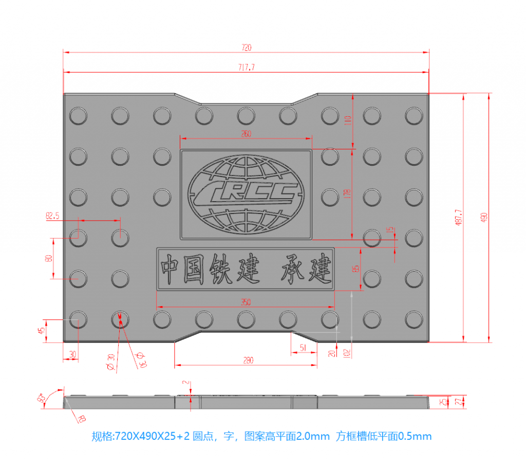 模具較薄,主要用于rpc材質預制制作,花紋為缺口圓點,中間帶有中鐵圖標,底部設有中國鐵建 承建字樣,為中鐵專用模具。