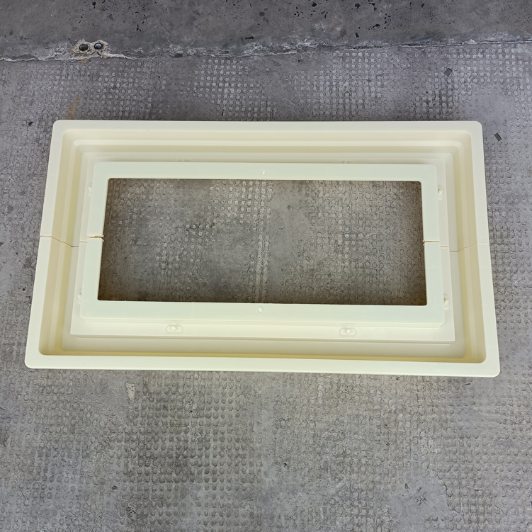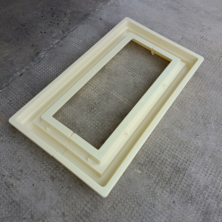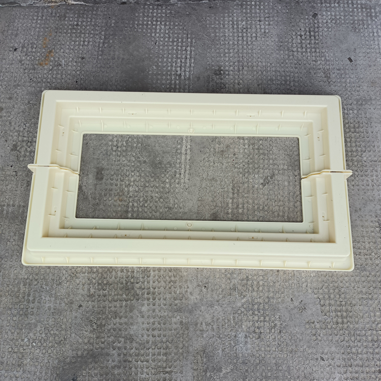 方井座塑料模具,模具采用拼接方式、為兩個組裝而成、寬度可以增加調(diào)節(jié),有設配件井座B,該長度、寬度尺寸為模具尺寸最外邊、包括翻邊。