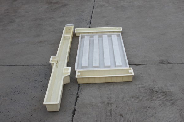 欄片模具則采用PP聚丙烯材質,更好的模具韌性對施工面積較大的水泥制品更為有利。水泥護欄欄片模具的尺寸為149.5×96.5x9cm,采用5幅式欄桿設計。